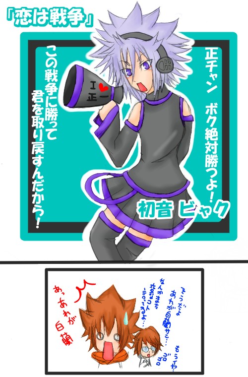 それにつられて、ちょっとぐらい前から私も久しぶりにミクの曲を聞いてるのですが、個人的に最近ミクの「恋/は戦争」が何回聞いても今(ちょっと前ぐらいから)の本誌での白蘭の心境に聞こえてしかたありませんwwww(白正的な意味で)